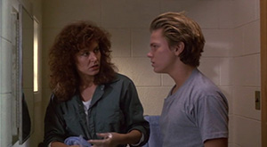 Après un fondu enchaîné, la scène resserre le cadre autour de Danny et de sa mère dans la salle de bain du motel. Privé de son clavier et de son reflet, l’adolescent est confronté à une autre forme d’effacement : celui de son apparence. Sa mère lui teint les cheveux en blond pour qu’il puisse endosser une nouvelle identité. Le geste est doux mais implacable, et la mise en scène souligne sa portée symbolique : Danny doit une fois encore se réinventer, au prix d’un changement d’apparence. Le miroir du lavabo, pourtant placé face à lui, ne renvoie aucun reflet — comme si l’image du jeune garçon refusait d’exister sous ce déguisement de circonstance.