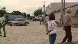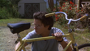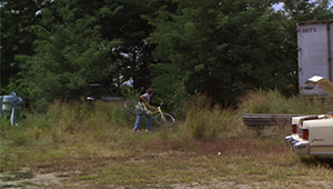 Après une ellipse temporelle marquée par un simple « cut », la deuxième scène retrouve Danny roulant sur sa bicyclette. Bien que le personnage soit désormais montré seul dans un vaste décor ouvert, le découpage prend toutefois le relais pour réinscrire le motif de l’enfermement: c’est à cet instant précis que l’adolescent repère effectivement qu’il est repéré. Il fait alors semblant de vérifier son vélo, « jouant » donc de nouveau pour, en réalité, contrôler le coin de la rue, duquel apparaît en contrechamp la voiture qui a précédemment fait demi-tour pour venir se positionner en planque. Revenant un instant sur Danny, qui se tourne pour observer l’autre côté, le montage passe au coin de rue opposé, confirmant qu’une seconde voiture se poste pour surveiller le bout de route balisé. Physiquement comme symboliquement (par le montage), Danny est à nouveau cerné, pris cette fois dans un cul-de-sac dont il ne peut sortir qu’en rebroussant chemin. Son échappée s’accomplit par l’intermédiaire de deux plans qui s’enchaînent en raccord mouvement, reflets inversés de ceux qui l’ont amené là : d’un plan rapproché dans lequel Danny se relève, la caméra accompagne ensuite le personnage reprenant la route en un panoramique droite/gauche. Les deux voitures, comme le découpage, forcent ainsi le personnage à faire demi-tour, dans une dynamique opposée à celle qui le ramenait chez lui.