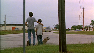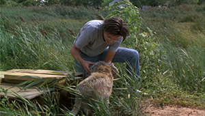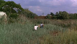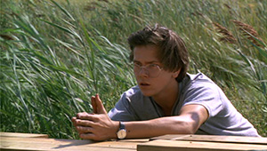 Le plan suivant reprend Danny dans sa course, par instants masqué par les hautes herbes. Bien que les causes de cette fuite soient pour le moment encore inconnues du spectateur, la tension dramatique s’amplifie, génère de l’étrangeté, du « jeu » (au sens mécanique du terme), tout en provoquant l’adhésion. Cette quatrième scène reprend le principe de la deuxième et décline l’idée du cheminement contrarié, de l’obligation de faire demi-tour. Les plans montrant Danny en train d’organiser le sauvetage de son frère Harry sont en effet encadrés par quatre prises de vue rigoureusement inversées et fonctionnant par paires : le premier plan montre l’arrivée de Danny jusqu’à la maison en panoramique droite/gauche, tandis que le suivant se focalise sur lui, accroupi dans l’herbe en plan rapproché pour appeler le chien Jomo, qui va servir de messager ; les deux plans de fin de séquence reprennent les mêmes valeurs de cadres, mais en reflet contraire des deux premiers, d’abord par un retour sur Danny en plan rapproché attendant la sortie de son frère, puis par un retour au plan d’ensemble de départ qui, cette fois, abandonne la maison à la faveur d’un panoramique gauche/droite accompagnant les fugitifs. Entre deux, le système de plans enchâssés est partiellement repris, lui aussi. Le chien, répondant à l’appel de Danny, vient vers lui : un raccord mouvement enclenche le contrechamp dans lequel, pour faire venir son frère, l’adolescent retire sa chaussure – signal de détresse qui semble sous-entendre que le jeune homme « marcherait moins bien » sans sa famille, ou du moins sans Harry. Deux vues de la maison « sans vie » créent un effet de suspension du temps, que le spectateur vit avec d’autant plus d’empathie que le jeu de River Phoenix, en quelques secondes, déploie toute sa richesse. Très vite, Danny passe en effet par trois phases signifiantes en joignant ses deux mains : il forme d’abord un double index accusateur (peut-être un canon pointé vers la maison), il croise ensuite les doigts des deux mains pour, enfin, les joindre, plaquées l’une contre l’autre, à la manière d’un signe de prière que le montage n’exauce, pour faire durer l’attente, qu’après un dernier plan sur la maison.