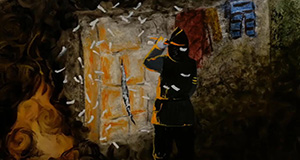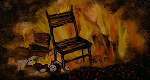La destruction du village est surtout représentée à travers des éléments symboliques : les flammes consumant une poupée, les meubles jetés à la rue ou encore un matelas lacéré à coups de couteau. Par métonymie, ces éléments expriment avec force l’annihilation méthodique de la vie du village. Un motif est partilièrement souligné : les plumes du matelas qui s’envolent dans la fumée noire avant de brûler. Le contraste entre la légèreté des plumes et l’obscurité de l’arrière-plan rend perceptible la fragilité de ce monde en train de disparaître.