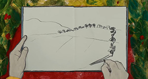 le plan suivant montre Kyona réalisant un croquis du village, dans un effet de rappel du carnet présenté dans le prologue, pour conforter le rôle de narratrice de Kyona. Le monde représenté apparaît ainsi d’emblée saisi par le dessin et inscrit dans une logique de mémoire.