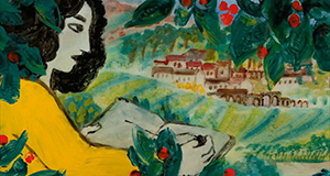 La séquence s’ouvre sur l’image de Kyona dessinant le paysage perchée dans un cerisier, tandis qu’Ariel cueille des cerises. Cette situation initiale est construite comme un moment d’harmonie, soulignée par la composition très structurée du plan. Le cadre organise l’espace selon une logique picturale : Kyona occupe le bord gauche de l’image, de profil, tournée vers le village situé en profondeur, tandis que le feuillage du cerisier vient fermer le cadre sur la droite. Le regard circule ainsi du personnage vers le paysage au sein d’une composition harmonieuse qui confère au village une place centrale.