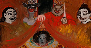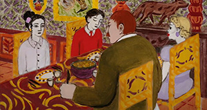 L’image bascule alors dans une vision fantasmagorique. Au son du rire des époux, leurs visages prennent une apparence bestiale, en écho aux trophées qui ornent la pièce. Le décor se dissout dans des teintes rouges et jaunes, donnant à la scène une dimension infernale, tandis que la transformation du couteau de table en poignard menaçant renvoie au conte horrifique (Barbe-Bleue). La révélation de la tête coupée de Kyona sur un plat condense le sens métaphorique de cette vision hallucinée : l’intégration imposée par le couple prend la forme d’une dévoration symbolique.