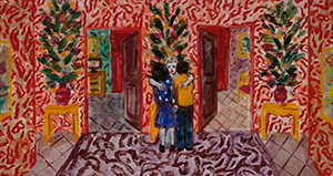 À l’intérieur, le manoir apparaît immense et silencieux. Les couloirs labyrinthiques résonnent des pas des personnages tandis que la lumière s’allume dans des espaces vides, au cours d’une visite scandée par des fondus au noir. La décoration surchargée, les trophées de chasse, les couleurs vives et contrastée proposent un environnement inquiétant et de mauvais goût suscitant un effet d’étouffement. Les chambres assignées aux enfants sont décorées sur un modèle identique : elles déclinent des couleurs criardes et des motifs enfantins stéréotypés (ourson, poupée), sans rapport avec leur âge. L’exclamation de Madame Della Chiusa — « la chambre de mes petits enfants » — leur impose une identité factice, conforme au seul désir de Florabelle.
